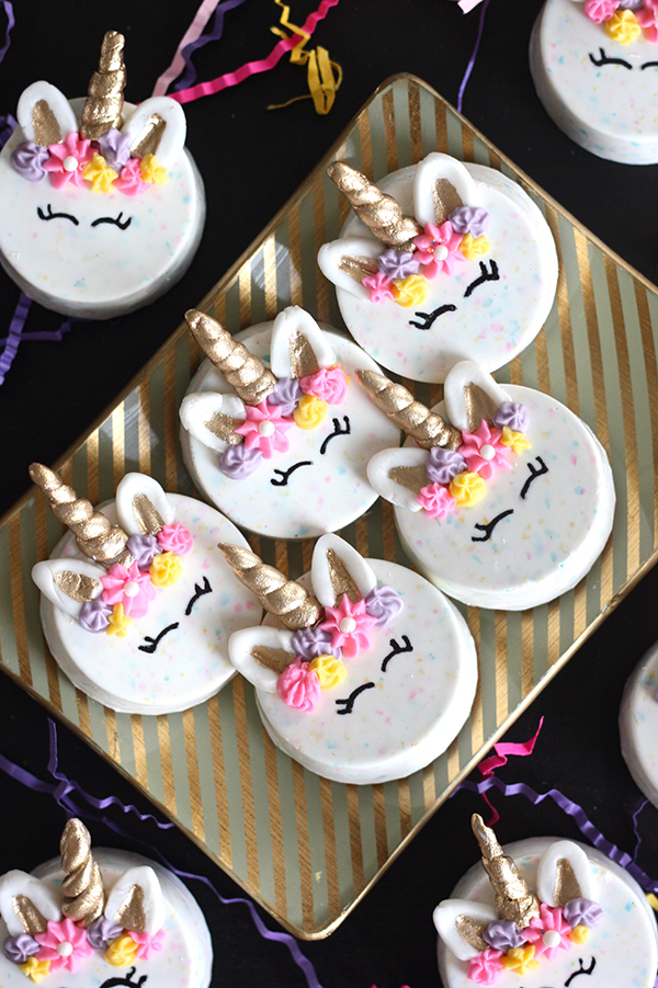 Mix up the royal icing according to the recipe’s instructions and divide into 3 piping bags with small star tips. Add rosettes and swirls of royal icing in the shape of random flowers to make a flower crown along the horn and ears. The royal icing will need to set overnight before packaging or serving. I waited until the royal icing was set before drawing on the eyes so I didn’t accidentally squish any of the flowers with my hand. The Oreos can be stored in an airtight container at room temperature for quite a bit, I made mine about a week in advance and they were great!