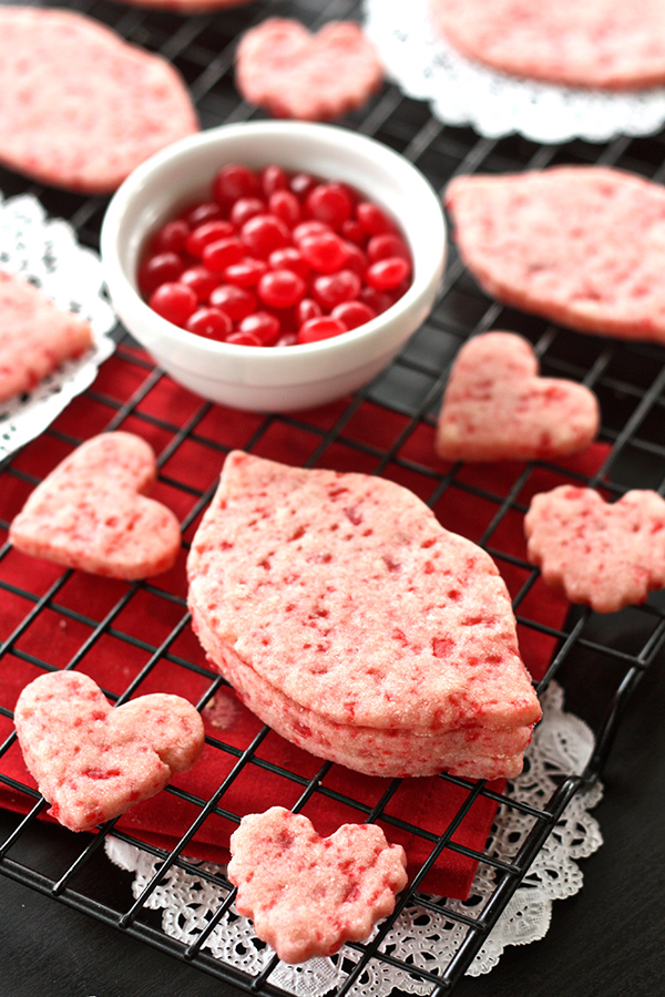 I spend a lot of time talking about sweets here on this blog, but definitely not enough time talking about cinnamon candy. Hot Tamales are my all-time favorite candy, but they’re not exactly conducive to adding to baked goods. I usually get a box of Hot Tamales from someone for every major holiday and I try not to buy them for myself because I’m just way too addicted. Good thing Valentine’s Day and my birthday are coming up!! Although Hot Tamales don’t make the best dessert ingredients, their crunchy counterpart – red hots- can be melted or ground up and worked into almost any recipe. I’ve made Red Hot Cupcakes before, and now I’m getting hot and spicy once again with these red hot shortbread cookies.